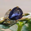 "Shine like a star with the "Luann" Sapphire Ring. This stunning ring features a 1.05 carat pear-shaped sapphire set in 18 karat yellow gold, flanked by two 0.25 carat marquise cut diamonds. With a finger size of 8.5, this ring is the perfect fit for any fashionable and playful individual.